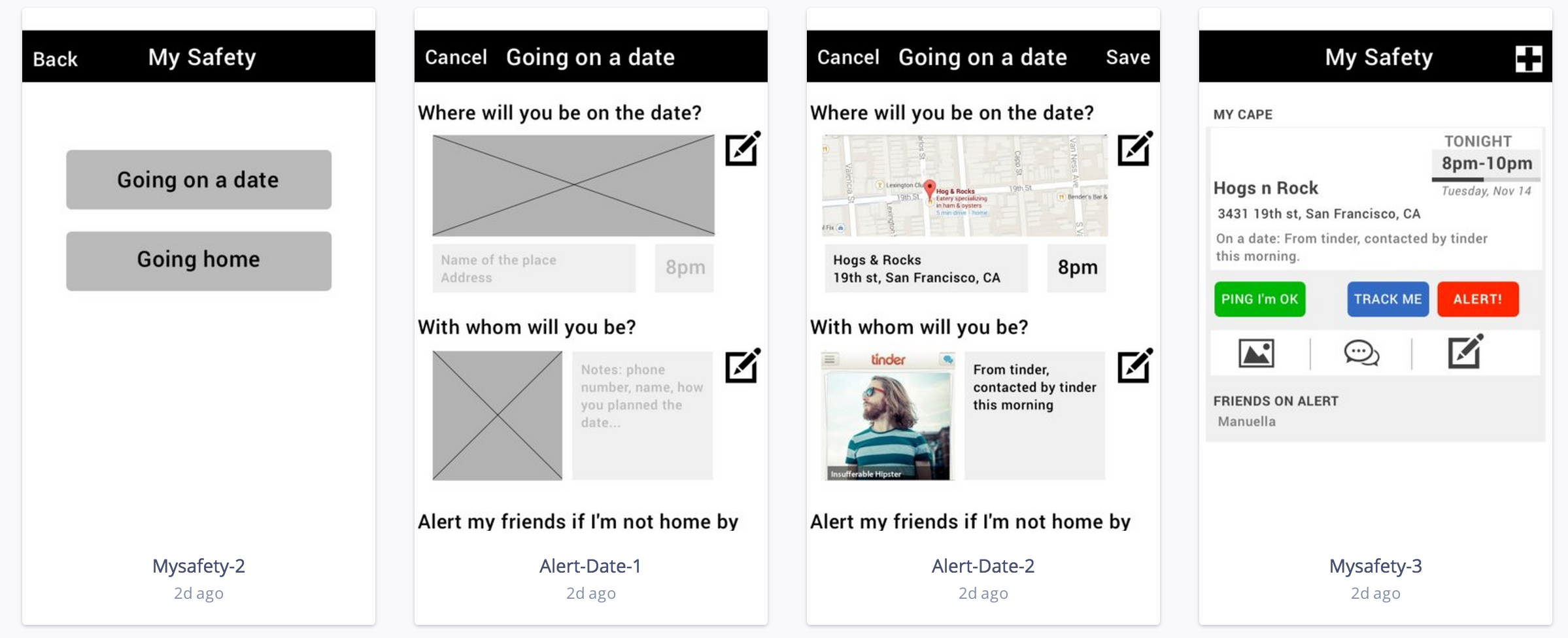 - “Going on a date” flow: built the feature where users could log date info (location, time, person met, screenshots/notes) and select friends to be alerted if they didn’t return on time.