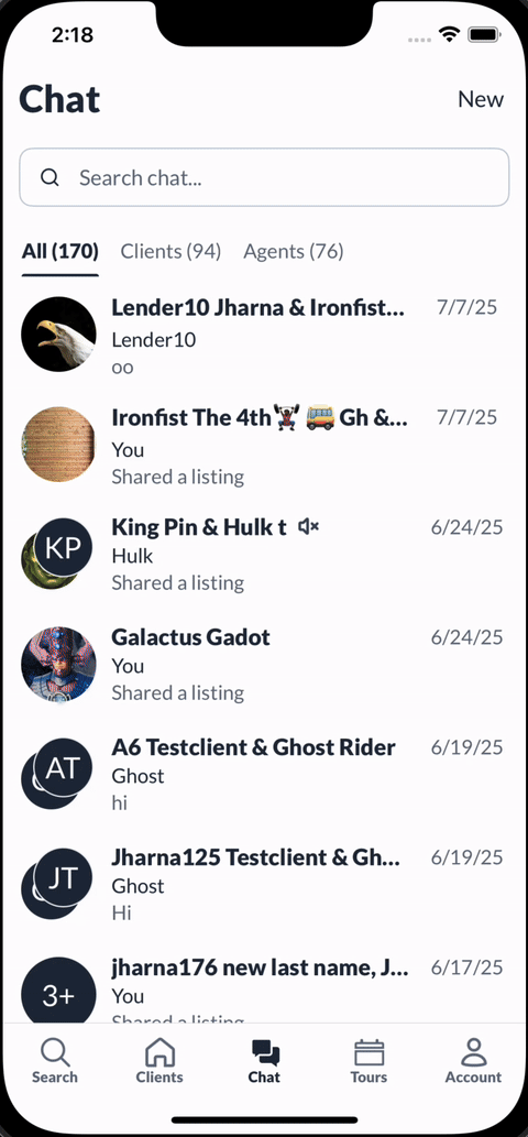 - Agents and clients can communicate via a regular chat messages, send listings.